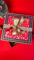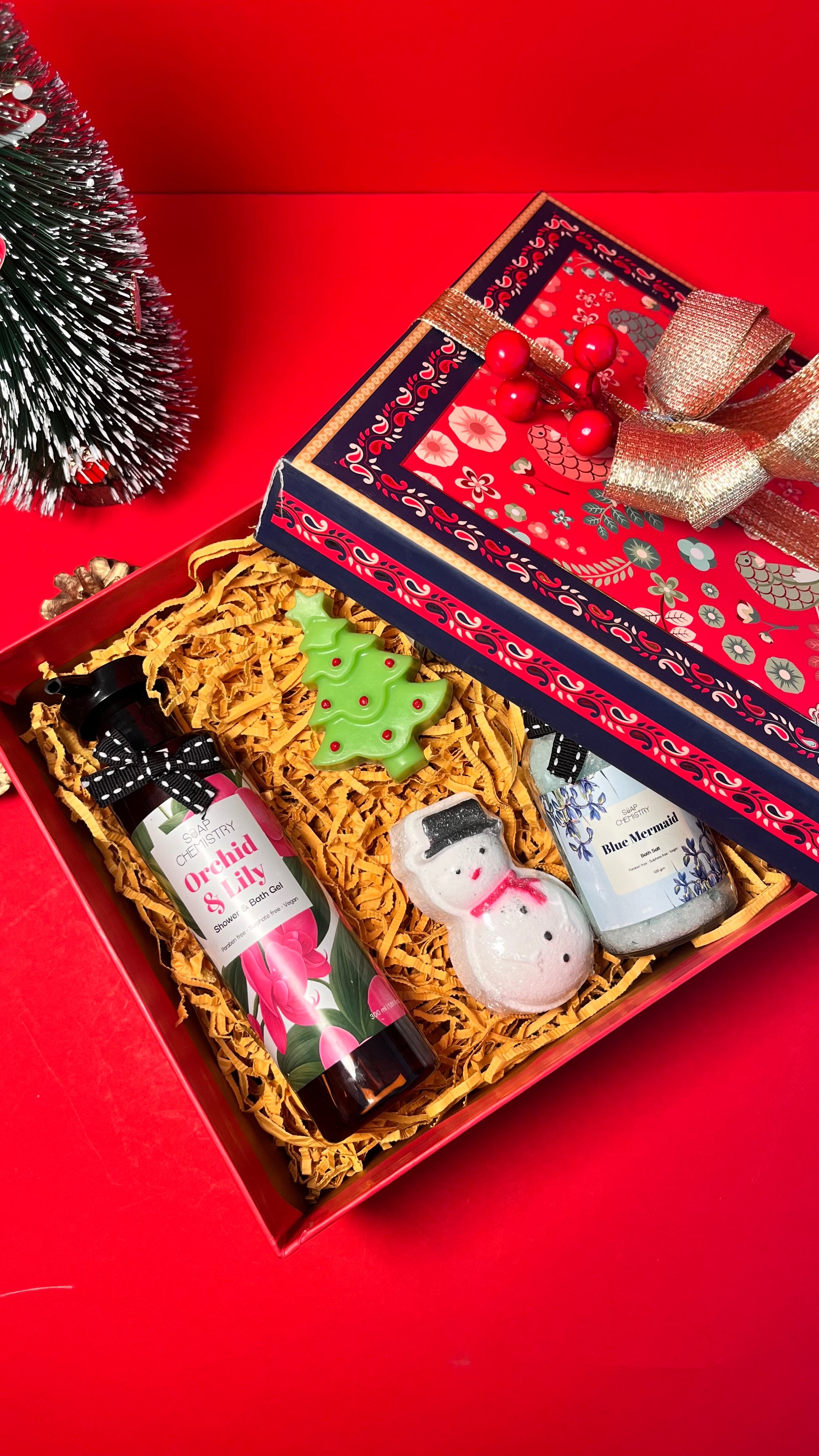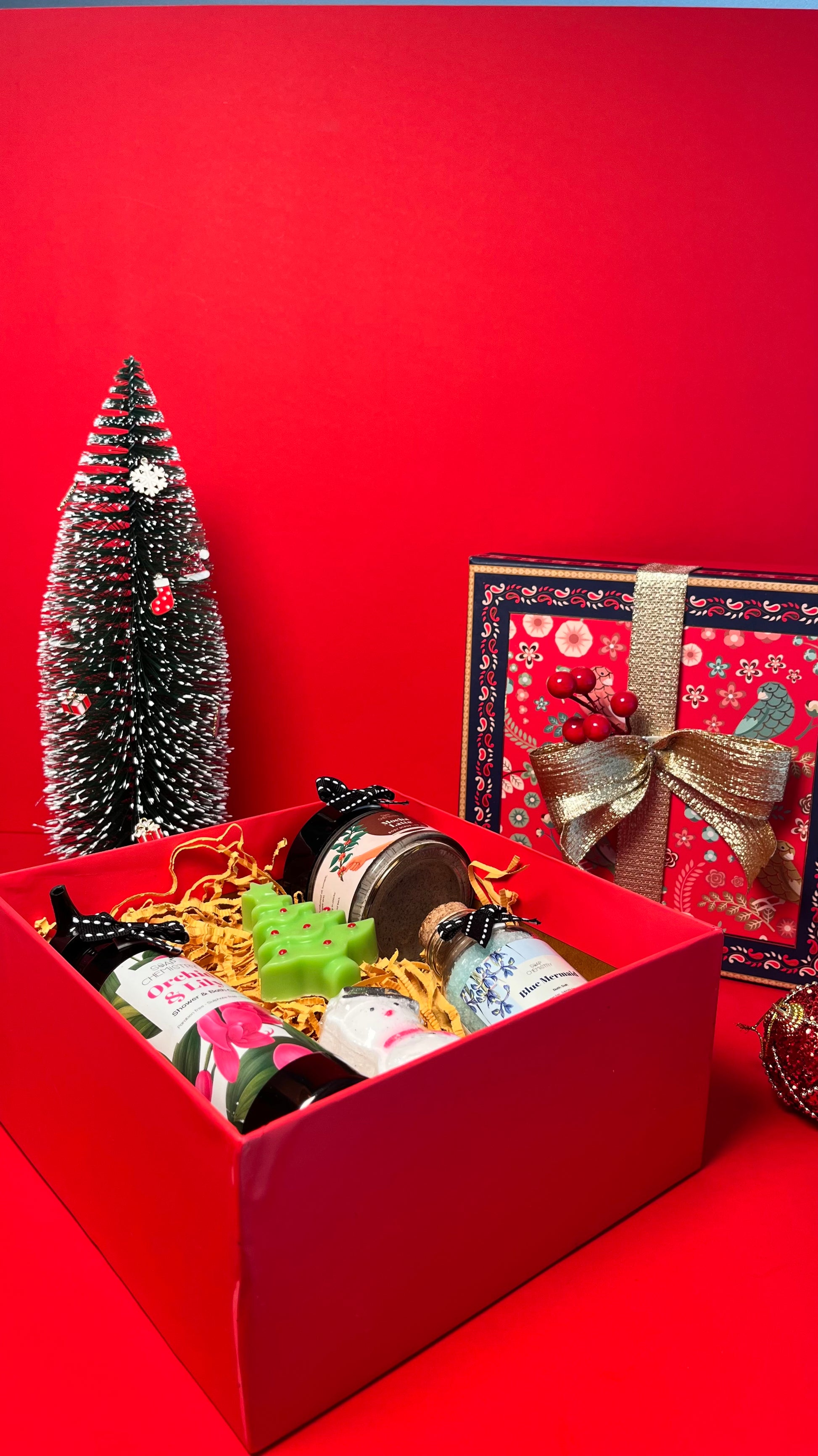 Festive Presentation: The products are beautifully nestled in shredded packing material within a vibrant Christmas red gift box.